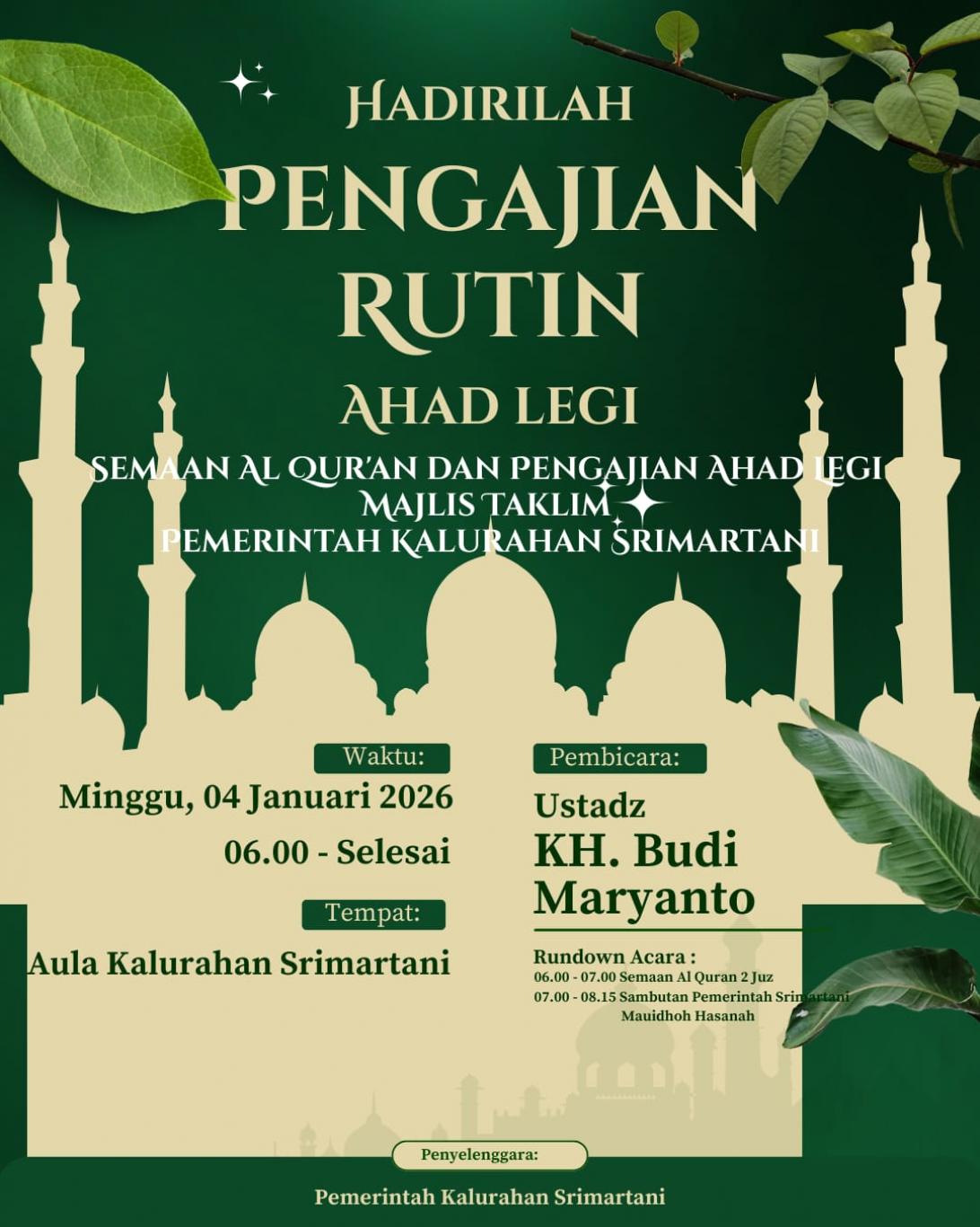Srimartani. Pemerintah Kalurahan Srimartani mengajak seluruh warga muslim di Srimartani untuk menghadiri pengajian umum rutin Ahad Legi pada hari Ahad 04 Januari 2026, di Aula Kalurahan Srimartani. Pengajian akan dimulai pada pukul 06.00 - 08.00 WIB.