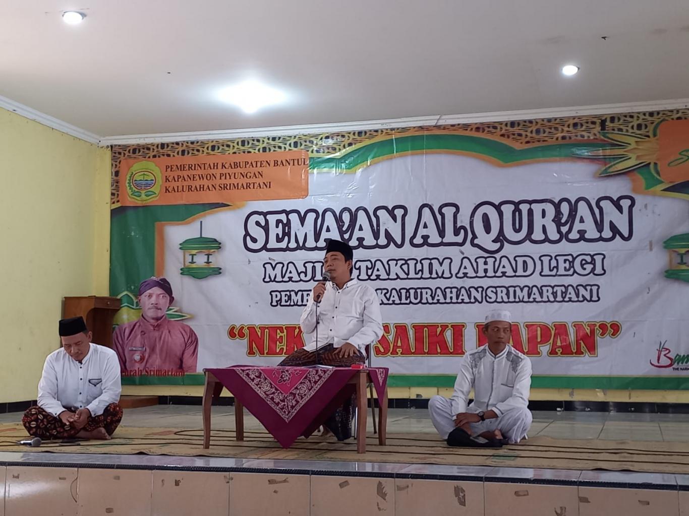 Srimartani. Dalam rangka mengajak masyarakat kalurahan untuk terus meningkatkan kualitas iman dan takwanya maka Pemerintah Kalurahan Srimartani mengadakan Kajian Rutin bertema Nek Ra Saiki Kapan. Kajian diselenggarakan pada setiap Ahad Legi dimulai pukul 06.00 dengan semaan Alquran 2 juz dilanjutkan tausyiah pada jam 07.00 hingga jam 08.00. Kajian ini diikuti oleh masyarakat umum khususnya warga Srimartani. Lurah H.Mulyana dan para pamong kalurahan turut hadir di dalamnya.