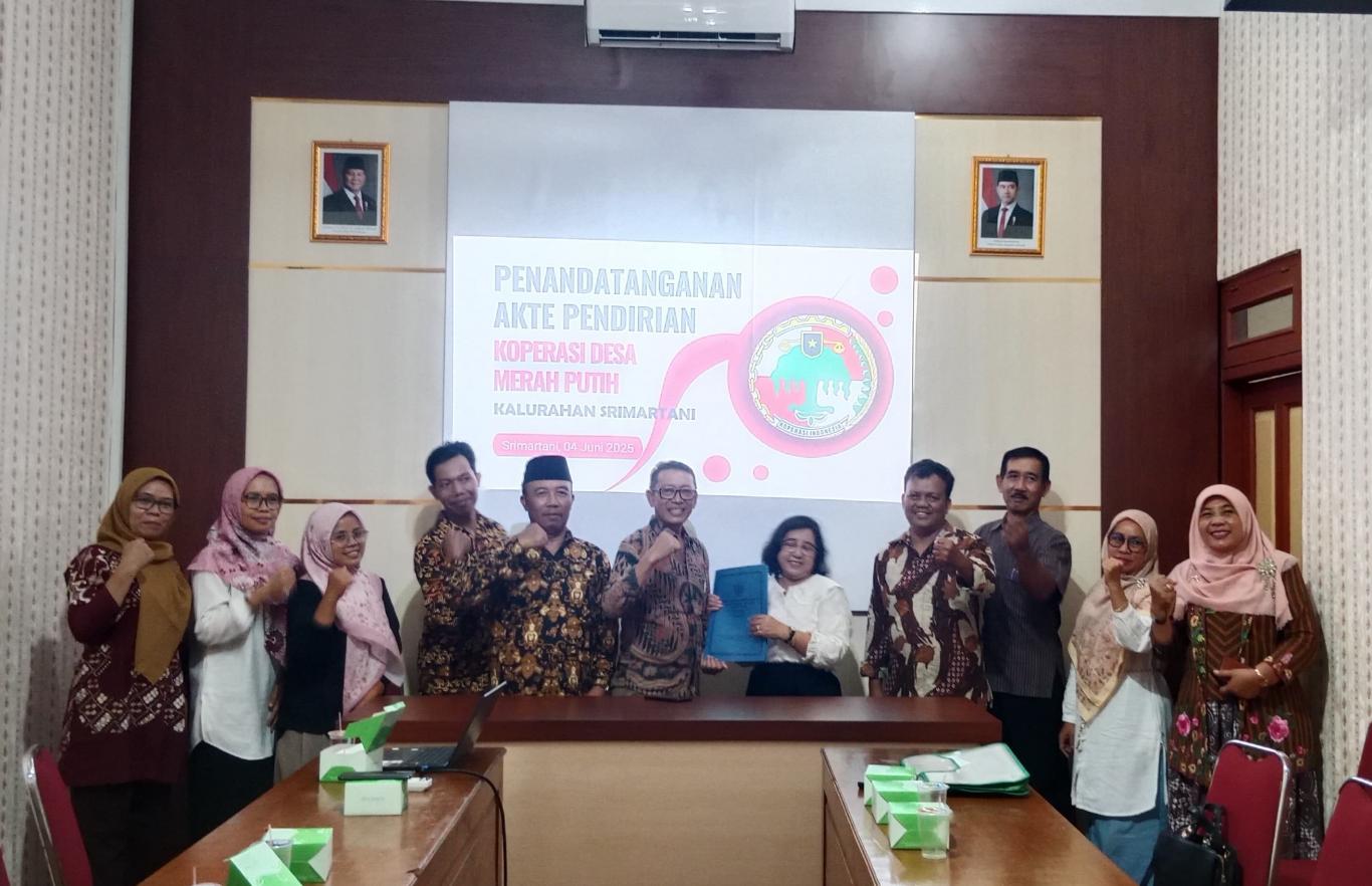 Srimartani. Memasuki tahap pembentukan Koperasi Desa Merah Putih (KDMP) Kalurahan Srimartani telah sampai pada ujung waktu. Penandatanganan Akta Pendirian telah dilakukan pada Rabu lalu (04/06/2025) oleh seluruh pengurus. Penandatanganan dilakukan di depan notaris Marieta Susilawati Pawan Gumanti,S.H. di ruang rapat Kantor Lurah Srimartani disaksikan para pengawas dan pendiri koperasi termasuk Carik Srimartani Eko Herri Purwanto yang ditunjuk melalui Musyawarah Kalurahan pada waktu yang lalu. Sebelum penandatanganan terlebih dahulu notaris menyampaikan klarifikasi mengenai profil KDMP yang akan dijalankan seterusnya sehingga dipastikan semua isian telah