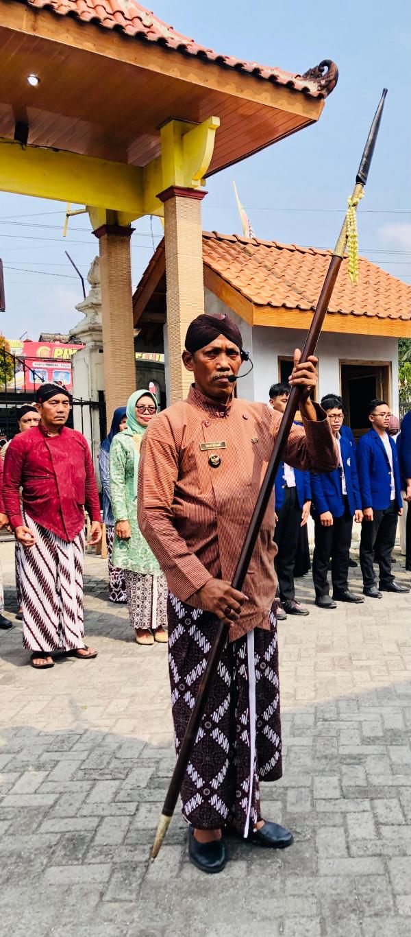 Upacara dilaksanakan di halaman Kantor Lurah Srimartani dengan mengenakan pakaian adat Yogyakarta serta pakaian kelembagaan masing-masing. Selain itu, protokoler upacara juga menggunakan tata cara dan bahasa Jawa. Pada penghujung upacara, Panewu Piyungan yang bertugas sebagai Inspektur Upacara (Penghageng Upacara) menyerahkan sebuah tumbak pusaka bernama Kyai Andong Wijaya Mulya kepada Lurah Srimartani H.Mulyana yang sekaligus bertugas sebagai Komandan Upacara (Pandega Upacara).